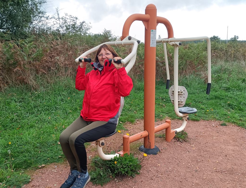 - Annie, motivée comme jamais, s’est lancée à l’assaut de l’appareil nommé Ascenseur (mobilisation articulaire garantie, montée d’ego comprise 😄).