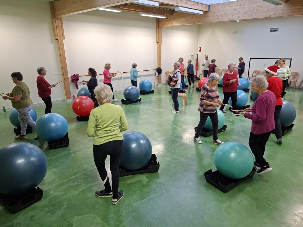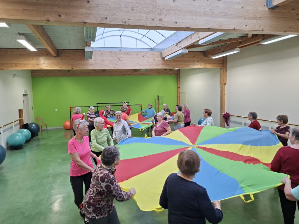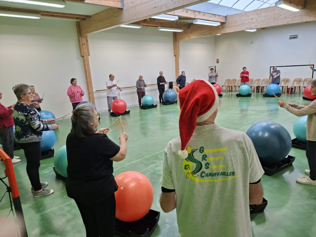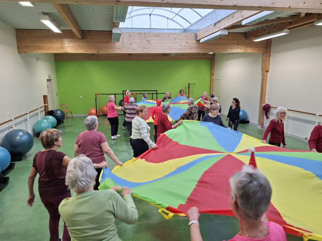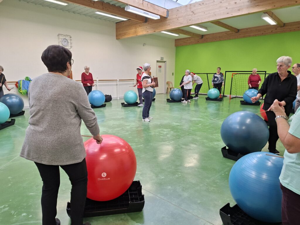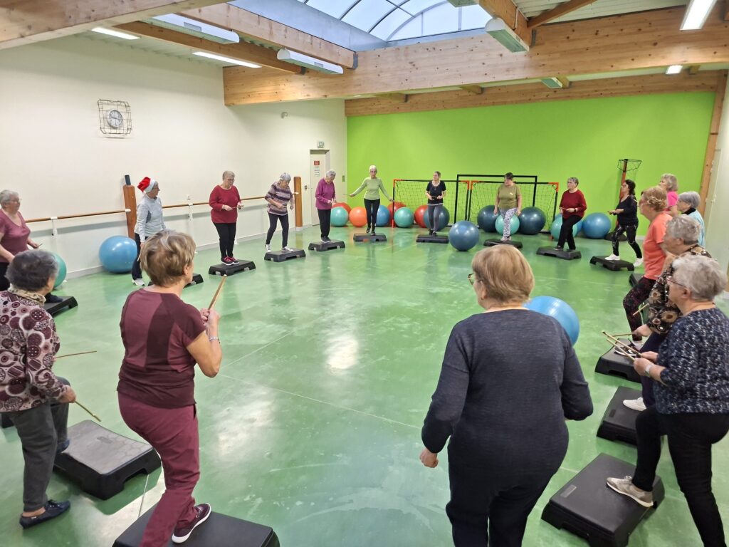 Forte participation dans nos deux groupes, tout le monde s’est prêté à une gym en cadence sur divers rythmes de musique proposés par Véronique et Nicole. Beaucoup de matériel était de sortie baguettes en bambou, gym ball, steps, ballons, parachutes… Pour terminer sur un jeu collectif de coordination et distribution de papillotes.