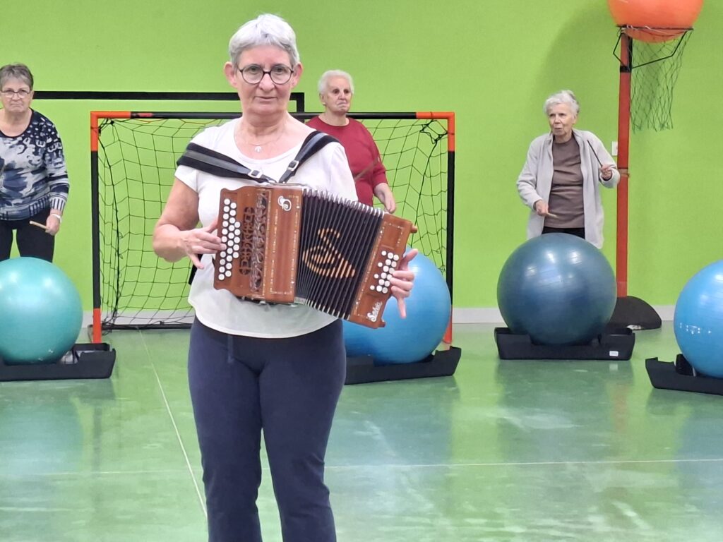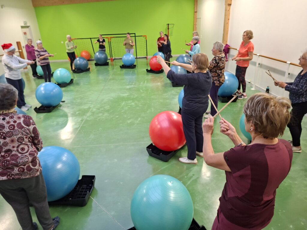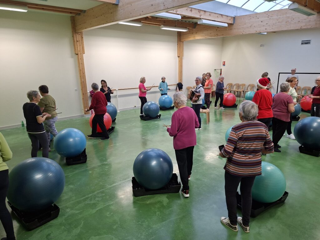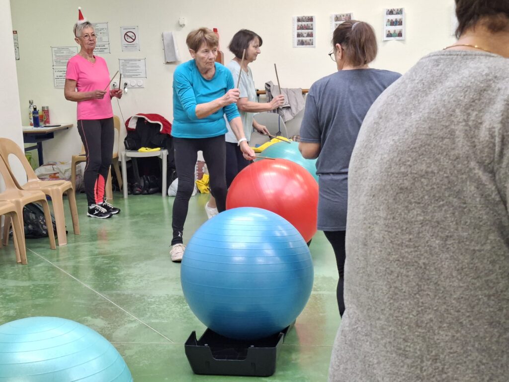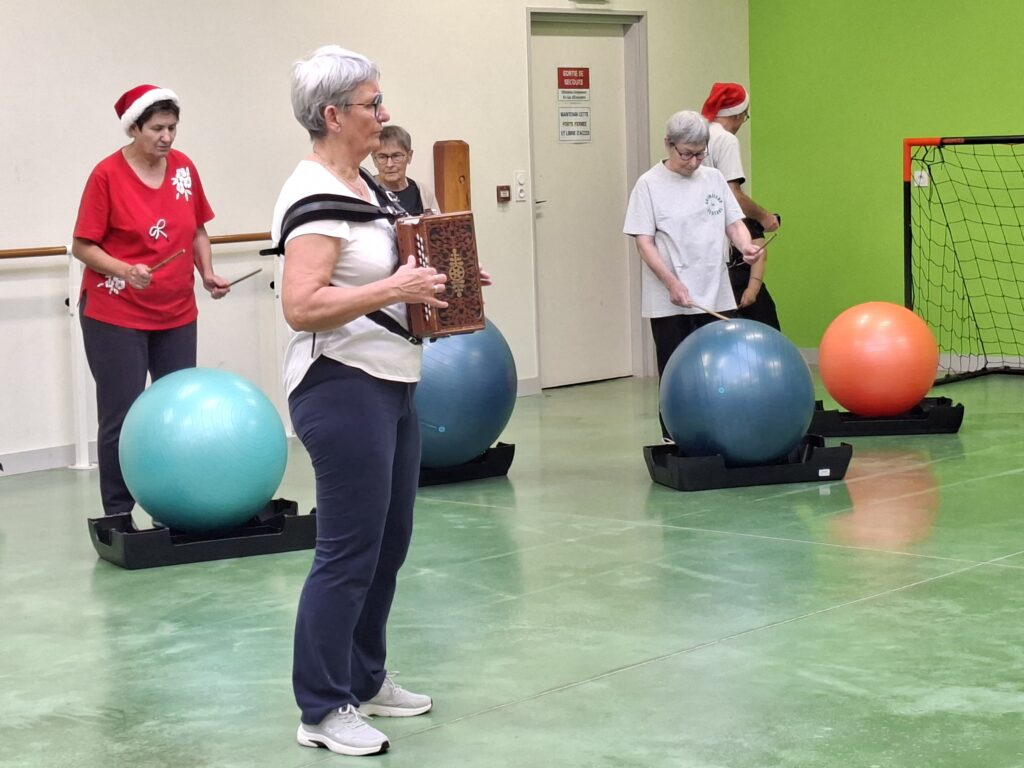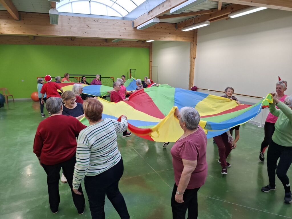 Forte participation dans nos deux groupes, tout le monde s’est prêté à une gym en cadence sur divers rythmes de musique proposés par Véronique et Nicole. Beaucoup de matériel était de sortie baguettes en bambou, gym ball, steps, ballons, parachutes… Pour terminer sur un jeu collectif de coordination et distribution de papillotes.