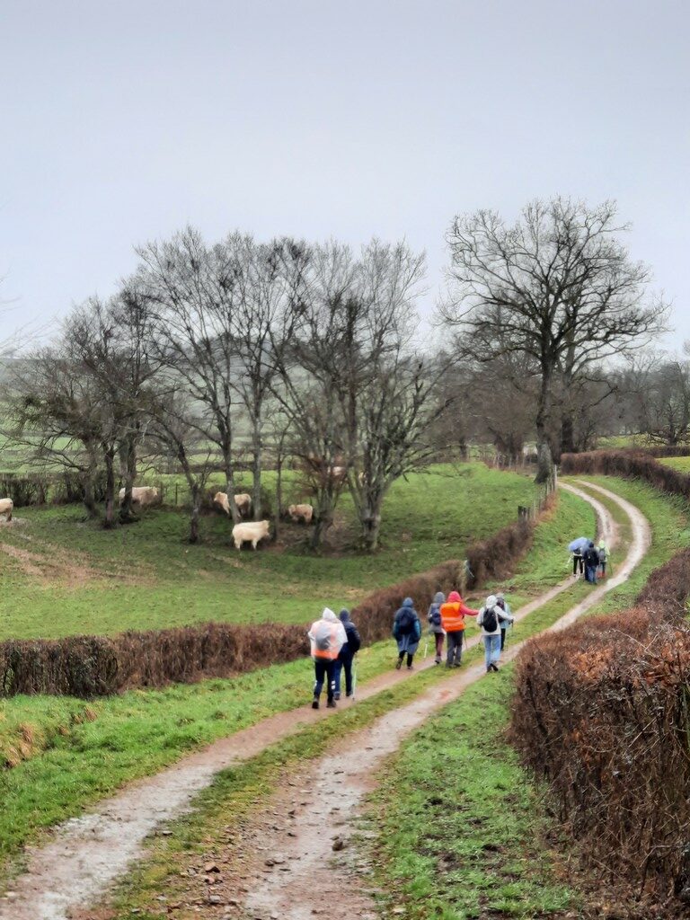 Nous étions bien 14 mais nous avons marché le nez penché en direction de nos chaussures couvertes de boue pour éviter de chuter sur des chemins si trempés et si vaseux que nous avions l’impression parfois qu’ils s’étaient transformés en ruisseaux.