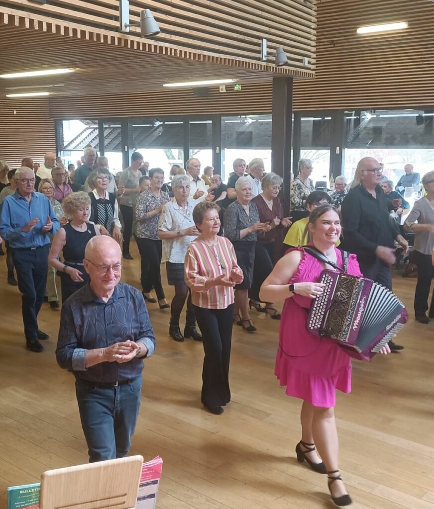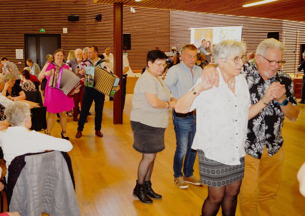 Autant dire qu’il n’y a pas eu beaucoup de temps pour souffler ! Nos deux artistes, armés de leurs accordéons et de leur synthétiseur, ont enchaîné les morceaux avec brio. Et comme si cela ne suffisait pas, ils ont aussi prêté leurs voix, pour le plus grand plaisir des danseurs… allant même jusqu’à descendre dans la salle pour partager quelques pas avec les participants. Ambiance garantie !